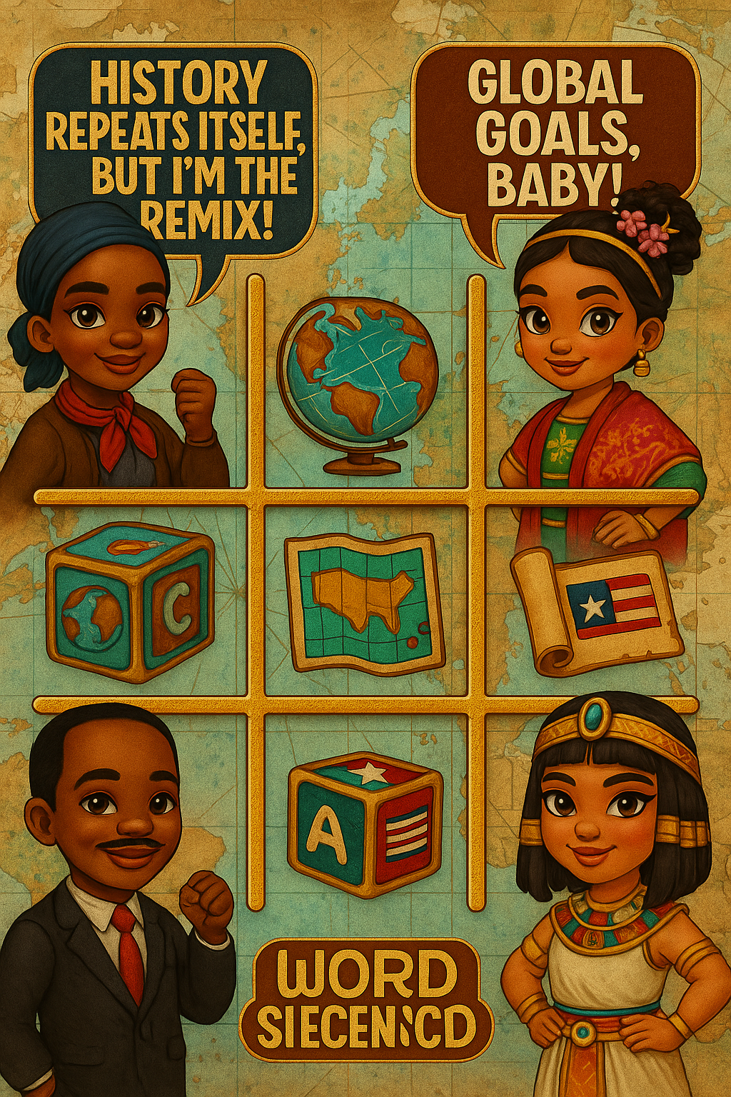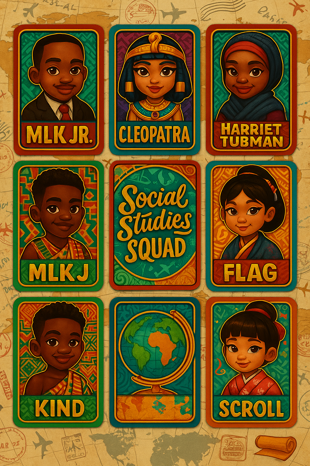 Celebrate culture, history, and global greatness in this educational-meets-iconic game set! This bundle brings mini versions of world changers like MLK Jr., Cleopatra, and Harriet Tubman to life alongside diverse global characters, iconic symbols, and bold affirmations.